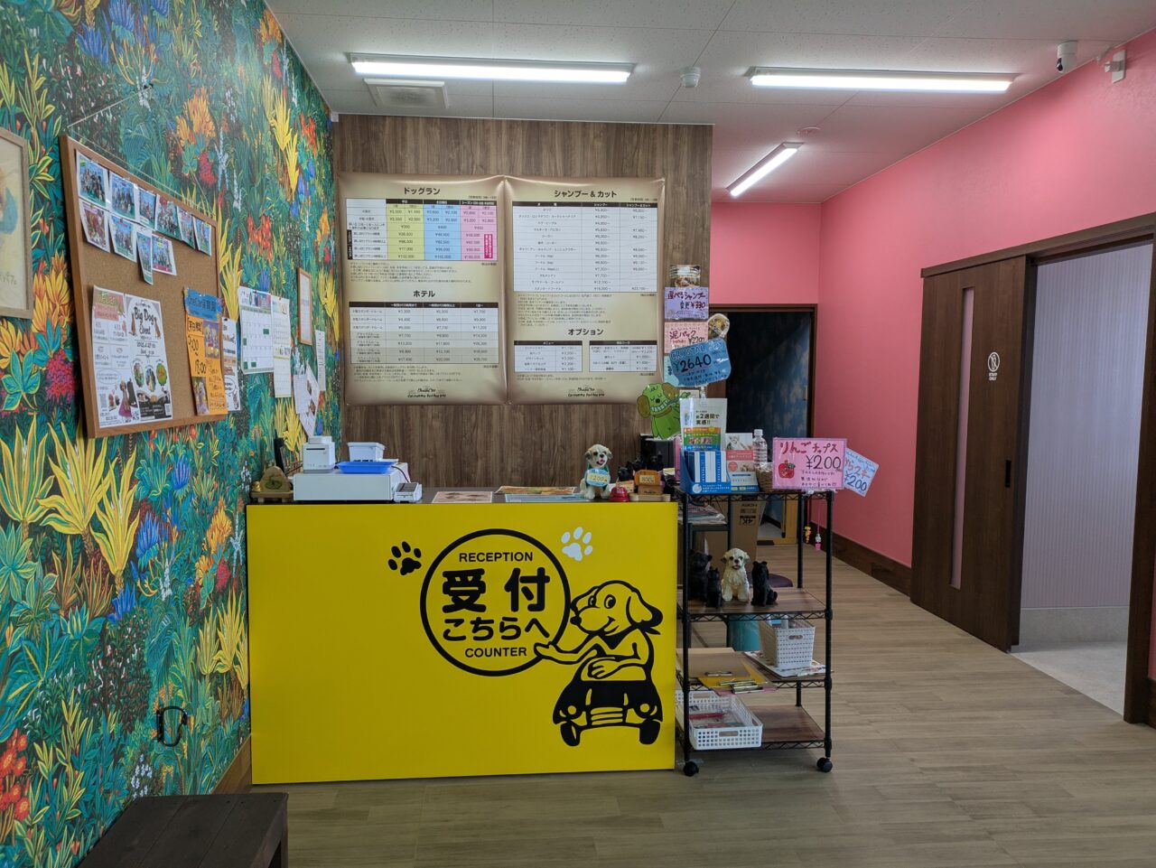 入り口を開けると、広い空間があり、奥に受付があります。こちらでは、室内に広いドッグランがあり、トリミングの施設と、奥にはホテルも用意されていました。