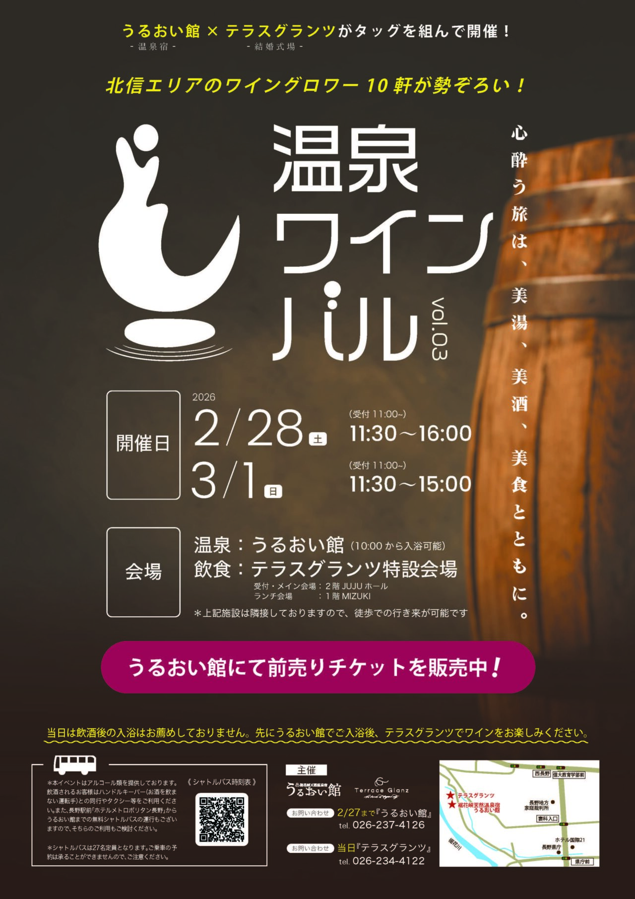 前売りチケットはうるおい館にて販売しているそうです。ワインなしや温泉なしという購入の仕方もできるようなので、気になる方は購入時に相談してみてくださいね。
