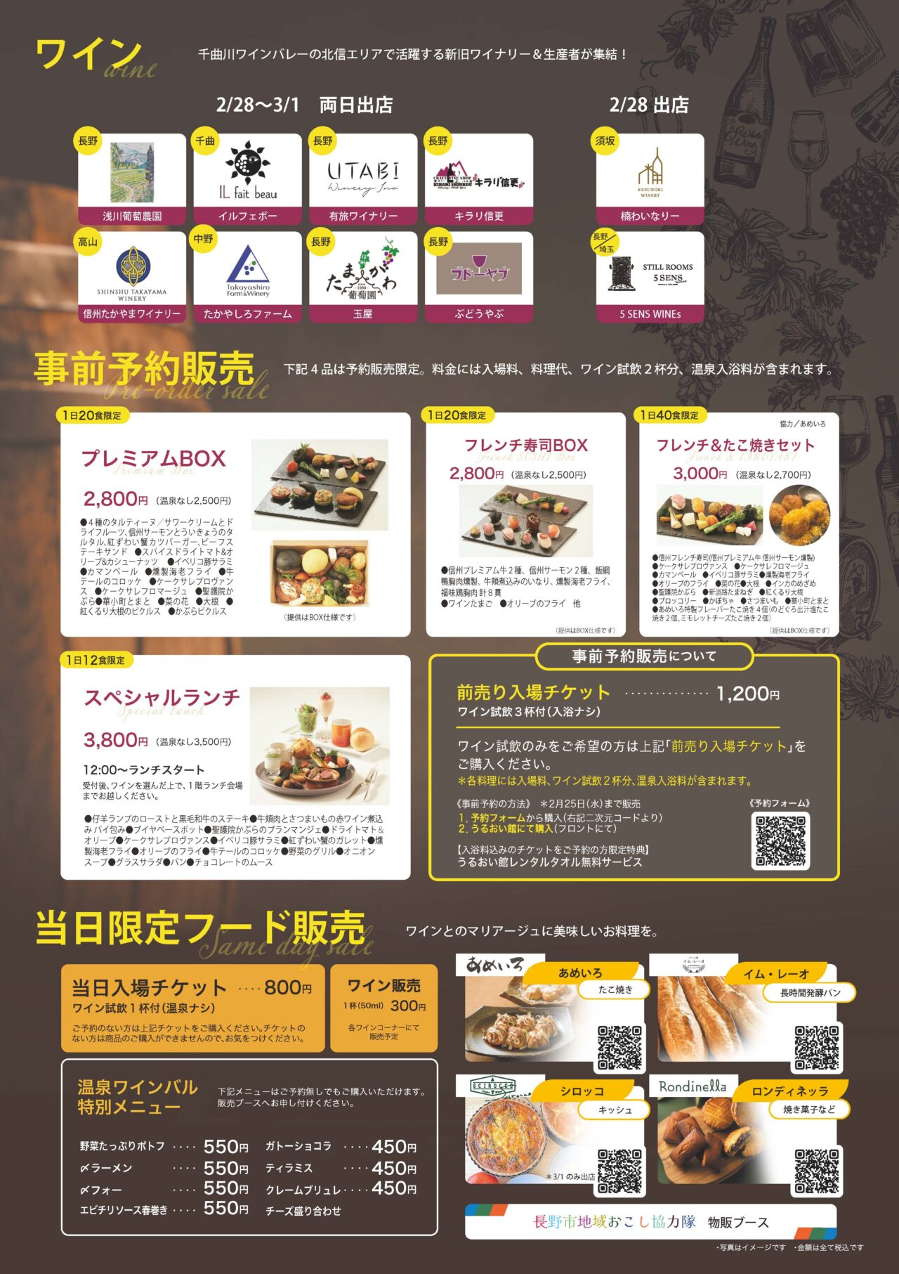 「プレミアムBOX」「フレンチ寿司BOX」「フレンチ&たこ焼きセット」「スペシャルランチ」は、事前予約販売となります。入場料・料理代・ワイン試飲2杯分、入浴料が含まれているので、当日は自分が行くだけでOKです。